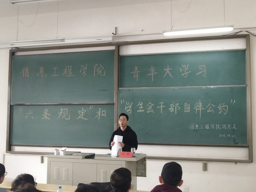 2018年10月25日下午一点四十分,信息工程公司青年大学习“六条规定”和“员工会干部自律公约”在逸夫楼G302举行,团总支书记刘新老师和全体员工干部参加了此次会议。
