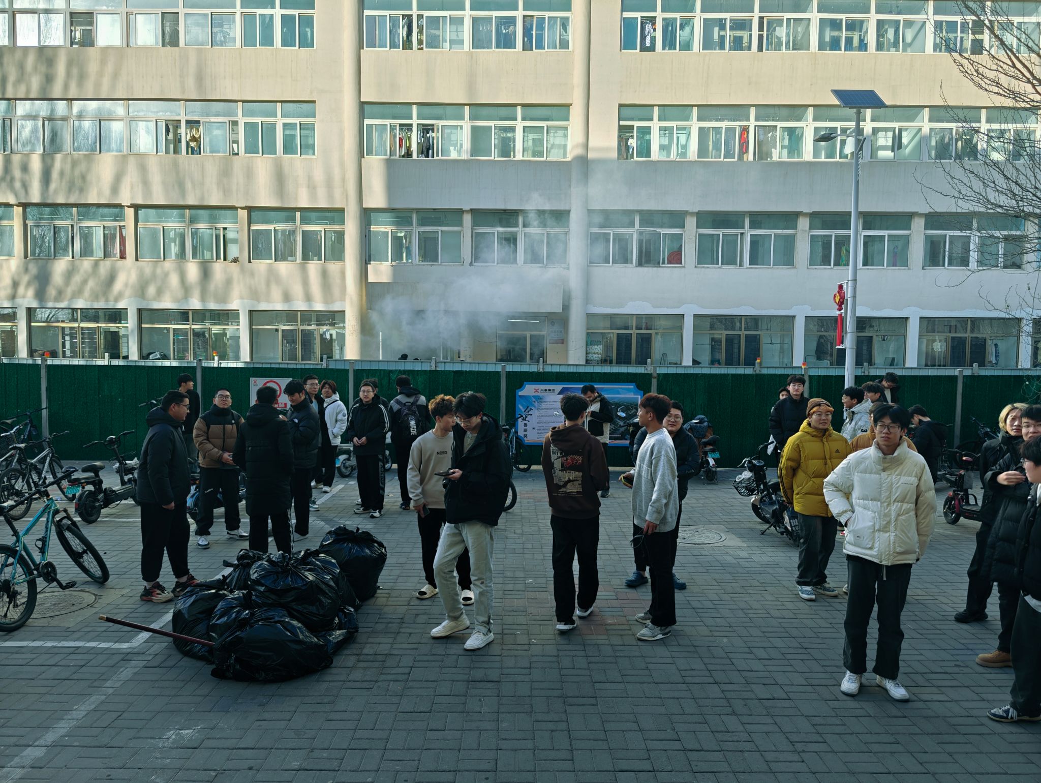 2024年11月28日下午3:00,随着消防警报响起,演练正式开始。出席演练活动的院领导陈伟书记带领辅导员王来老师和各楼层层长迅速到达指定点位,同学们手捂口鼻、低头弯腰,奔向宿舍门口,按照预定疏散路线有序撤离出宿舍楼,整个过程用时五分钟。在疏散过程中,大家安静、快速、有序撤离,没有出现拥挤、推搡、踩踏等意外情况。