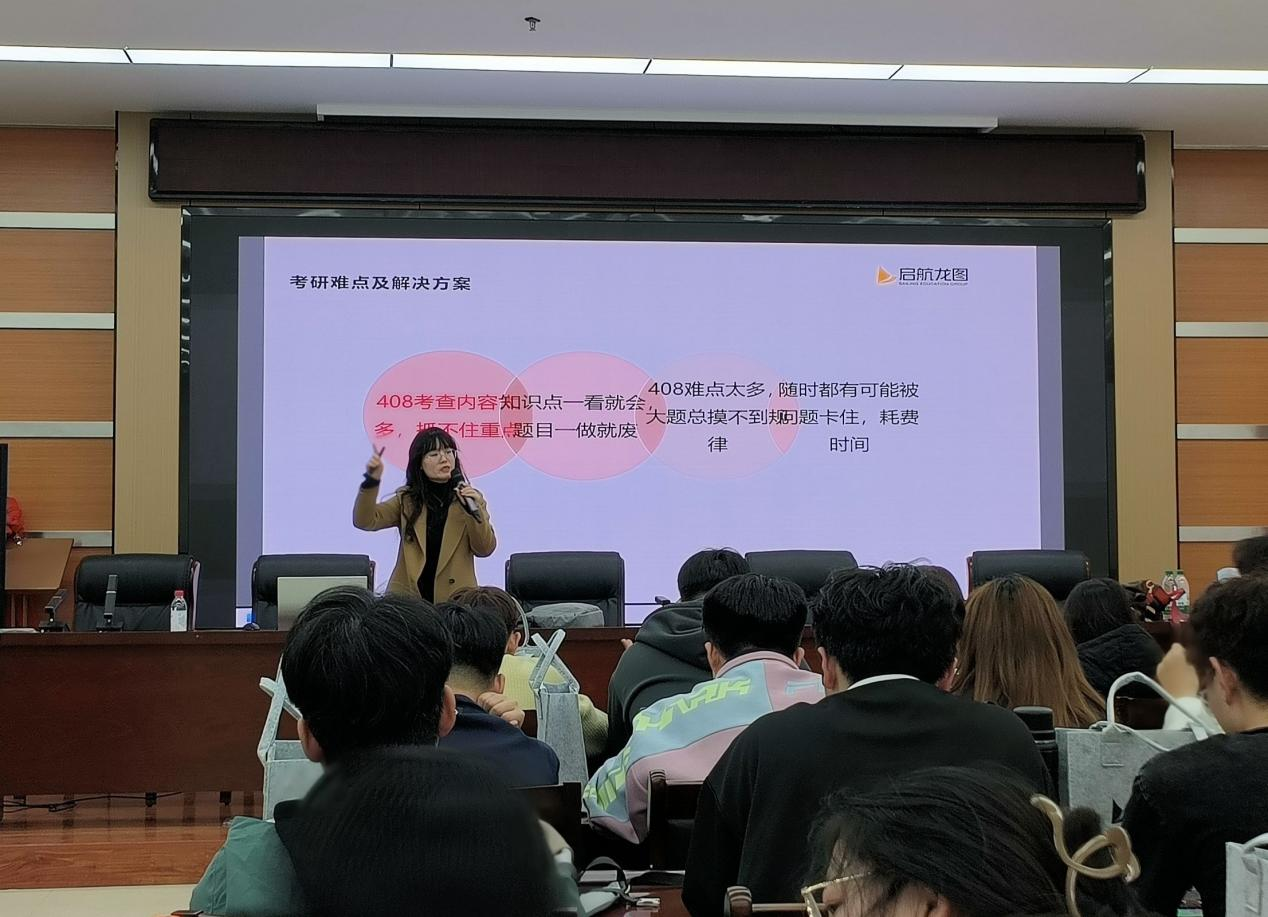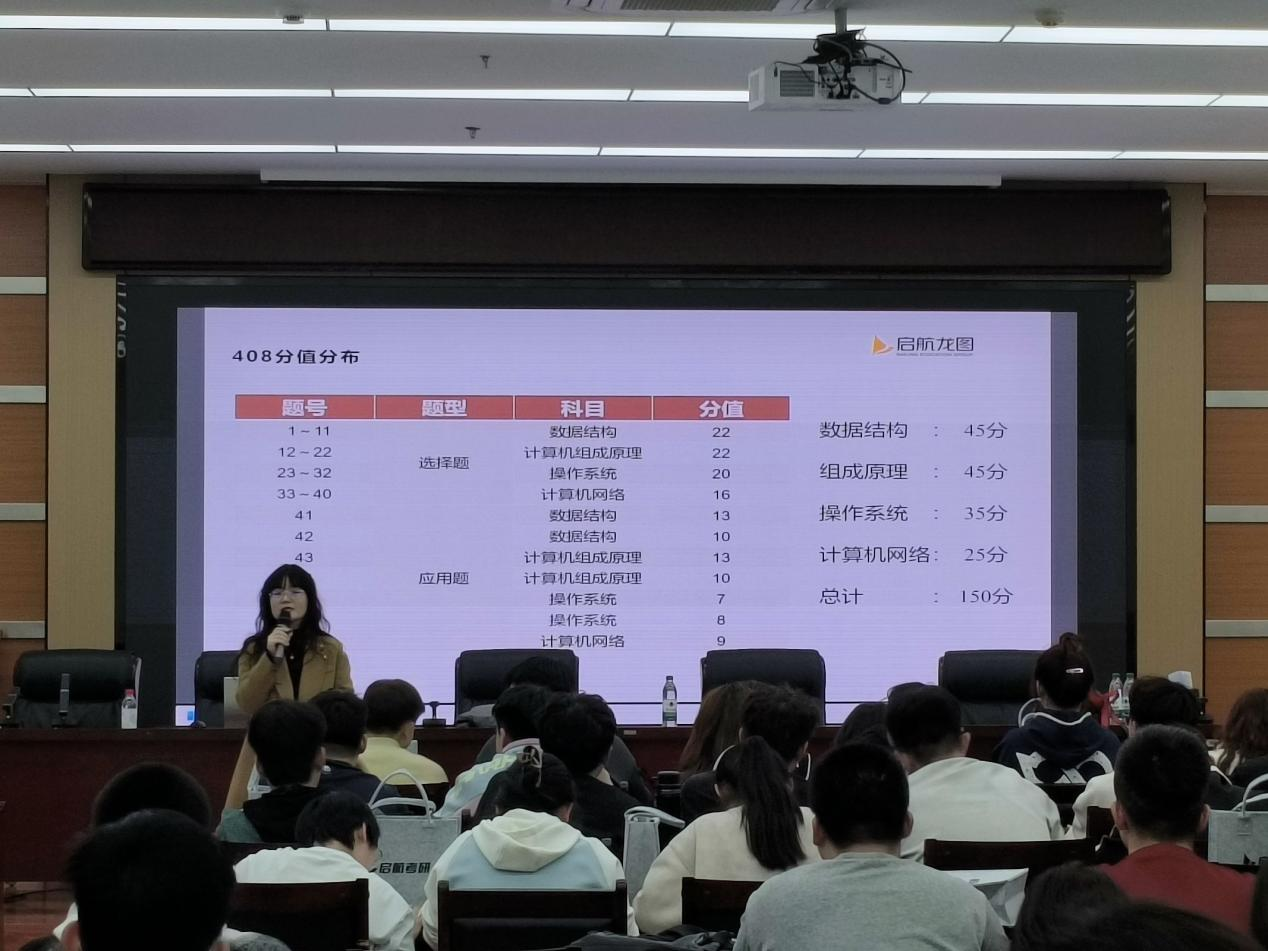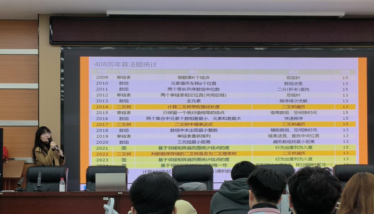 讲座开始后,张老师凭借丰富的教学经验和深厚的专业知识,围绕考研形势、院校专业选择、备考策略,以及计算机专业研究生就业趋势等同学们普遍关注的核心问题,进行深入剖析,为同学们提供科学的备考建议与专业指导。讲座结束后,还为同学们发放了计算机专业408考研相关书籍,助力同学们开启考研备考之路。